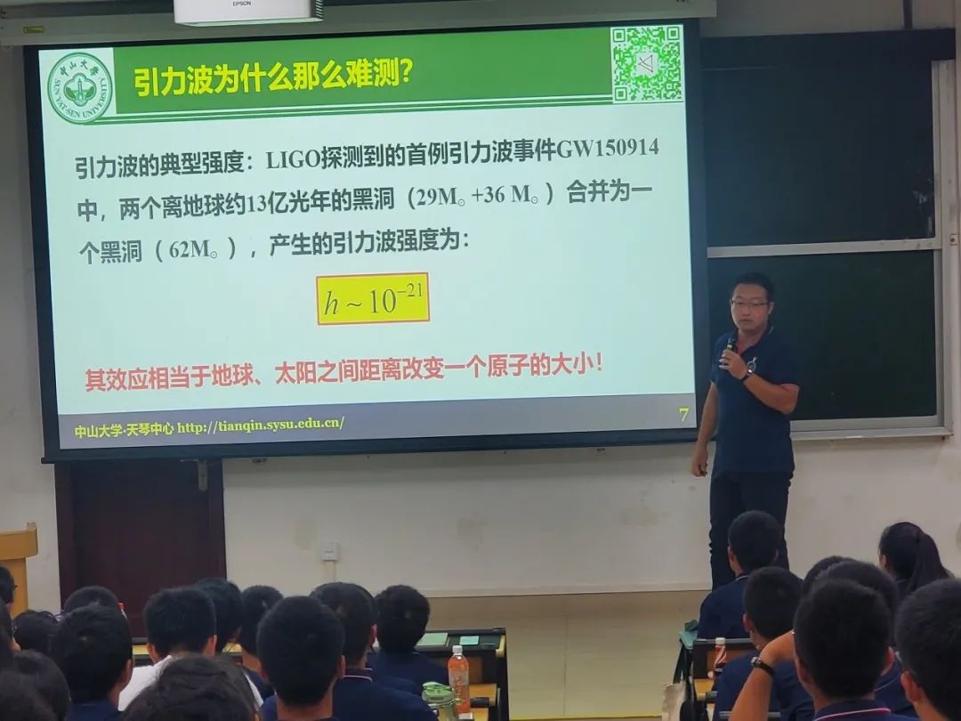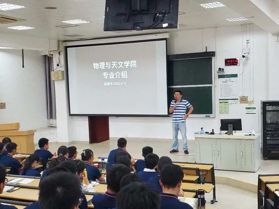 9月13日,俞振华副院长为新生们全面、详细的介绍了学院的本科专业。从历年考研数据以及学院本科阶段开设的课程入手,俞院长带领同学们认识了投身基础学科研究及深造的必要性,增强了同学们对物理学科以及大学学习生活的了解。俞振华副院长还介绍了学院的发展规划,向同学们介绍了天琴空间引力波探测计划、中国空间站工程巡天望远镜粤港澳大湾区科学中心两大国家级研究平台和广东省量子精密测量与传感重点实验室一个省部级平台,鼓励同学们努力学习进入关键科学技术领域,成为国家重大战略领域的后备人才。
