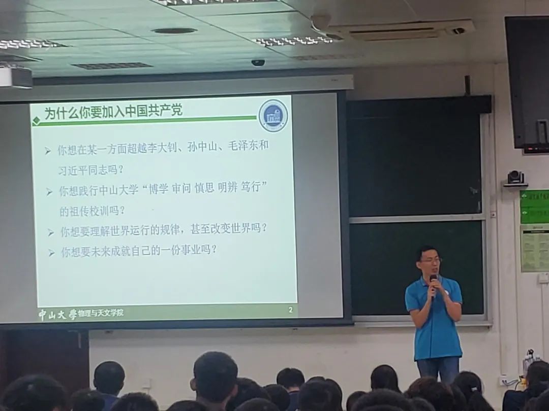 天琴中心的薛超副教授通过向同学们介绍空间引力波探测的发展历史及广泛应用、“天琴计划”项目进展,分享科研工作者们的党员故事,鼓励同学们积极投身面向国家重大战略需求的科研事业,以身边优秀师生代表为榜样,在青春的赛道上跑出当代青年最好成绩。马波副教授结合自身的经历,与同学们分享了关于“为什么大学生要积极入党”“为什么学院学生党支部需要你的加入”以及党员与科学家身份之间是如何相互作用等方面问题的思考。