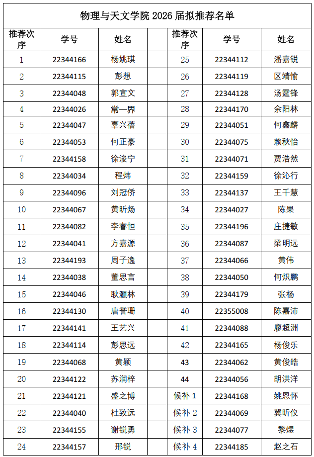 根据《中山大学推荐应届本科毕业生免试攻读研究生工作实施办法》(中大教务〔2025〕2号)、《必一·运动(B-Sports)-「登陆注册开户官网」推免资格认定遴选细则(2023年10月修订)》(物天教务〔2023〕121号),经学生申请,学院审核,必一·运动(B-Sports)-「登陆注册开户官网」60名学生(不含1名放弃学生)符合推免基本要求,其中44名同学拟获免试攻读研究生推荐资格,现将名单予以公示如下(名单按推荐次序排序):